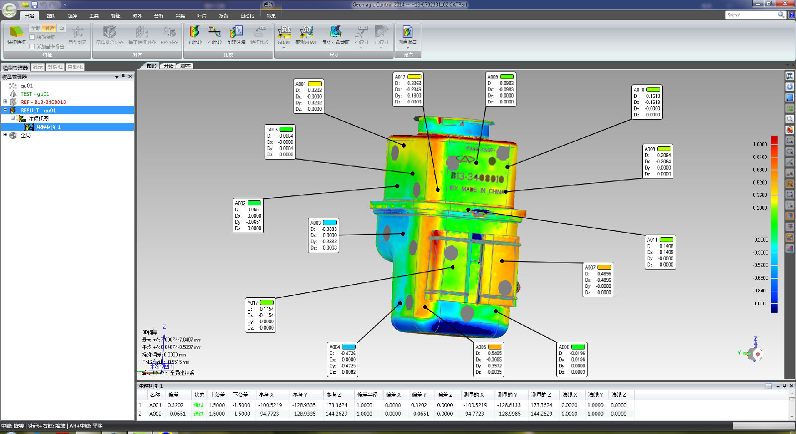 使用手持式三維激光掃描儀對汽車配件等工件進行掃描外形數(shù)據(jù),將其與標準數(shù)模進行3D最,得到工件的偏差分布色譜圖。在色譜圖上對重點區(qū)域進行創(chuàng)建注釋,得到該區(qū)域的具體偏差數(shù)值。通過此方法,可以快速直觀的判斷該工件的精度尺寸是否符合要求,即判斷該工件對否合格。