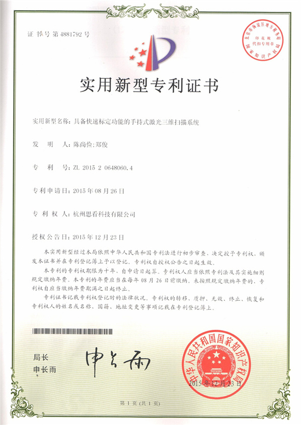 當(dāng)前位置:網(wǎng)站首頁(yè) > 關(guān)于思看 > 企業(yè)資質(zhì) > 具備快速標(biāo)定功能的手持式激光三維掃描系統(tǒng)-實(shí)用新型專利