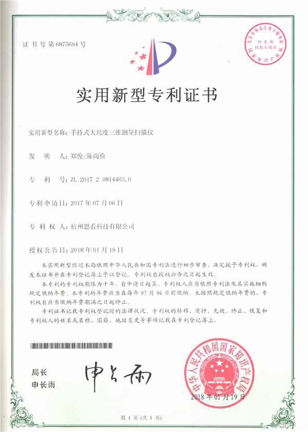 當(dāng)前位置:網(wǎng)站首頁 > 關(guān)于思看 > 企業(yè)資質(zhì) > 手持式大尺度三維測量掃描儀-實用新型專利