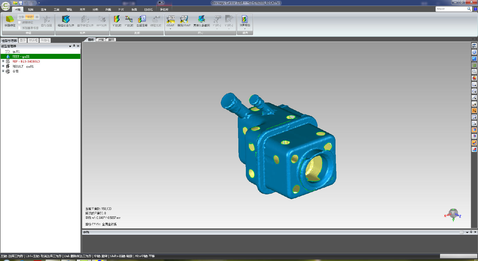 使用手持式三維激光掃描儀對汽車配件等工件進行掃描外形數(shù)據(jù),將其與標準數(shù)模進行3D最,得到工件的偏差分布色譜圖。在色譜圖上對重點區(qū)域進行創(chuàng)建注釋,得到該區(qū)域的具體偏差數(shù)值。通過此方法,可以快速直觀的判斷該工件的精度尺寸是否符合要求,即判斷該工件對否合格。