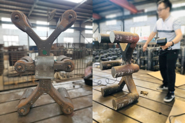 檢測的這個(gè)火車底盤結(jié)構(gòu)鑄件長約1200mm,寬約600mm,高約400mm,6個(gè)圓錐體支撐起上面的中間平臺,鑄件體積屬于中大型,多曲面、多夾角。需要測量出6個(gè)圓錐不同截面的直徑大小,各夾角度數(shù),中間平臺的長、寬等,為后續(xù)精加工確定數(shù)據(jù)。
