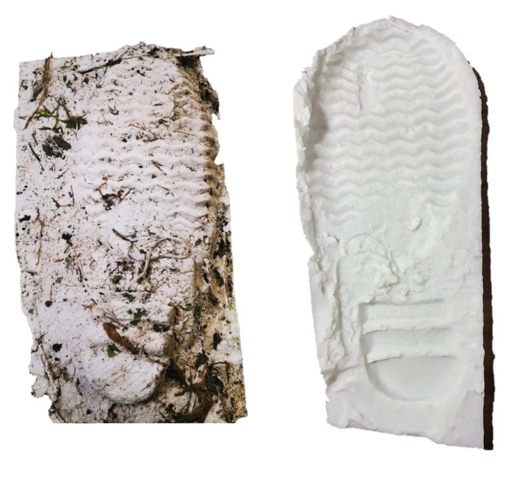 傳統(tǒng)的足跡提取采取石膏制模法,先在足跡周圍作一道2-4厘米高的圍墻,從足跡較低部位開始灌注石膏漿,待石膏凝固后取出,用水沖凈陰干,就獲得了石膏足跡模型。